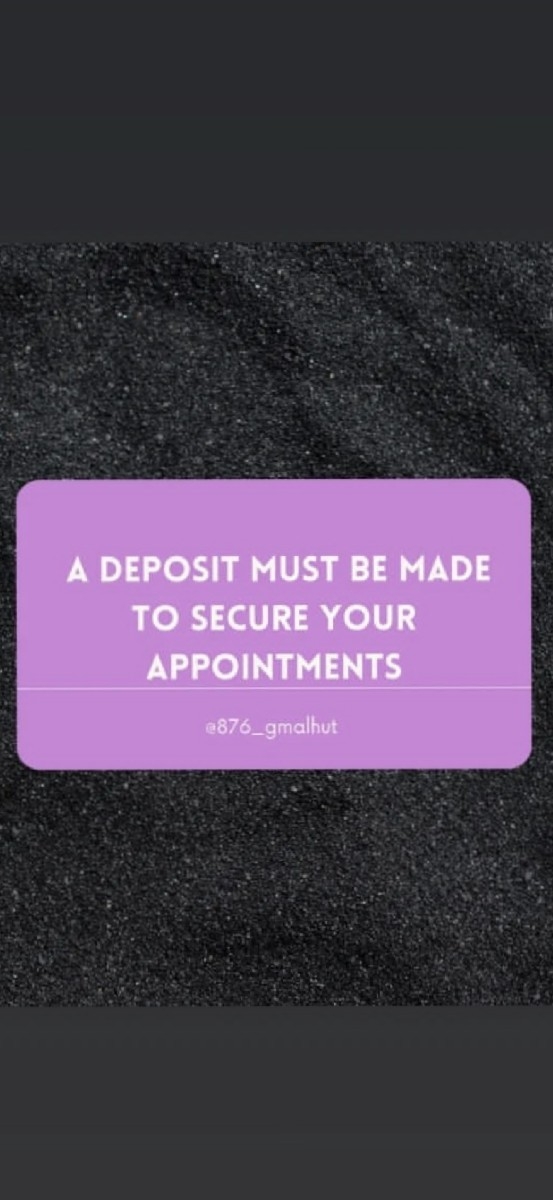 Here at 876_gmalhut we strive to ensure our clients have the most satisfactory experience with there services and the service provider . Feel free to book an appointment today also remember we only go by appointments unless otherwise notified.
