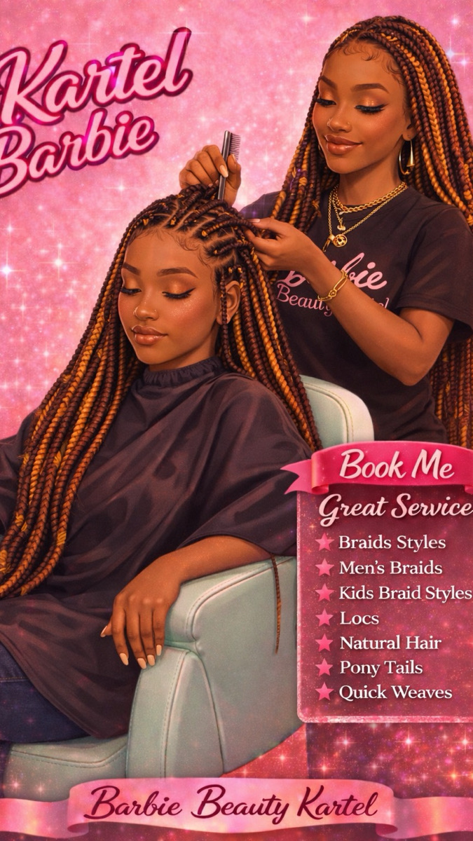 Welcome to Barbie Beauty Kartel. I’m San’Tasia Thee Kartel Barbie ,a Licensed Braider dedicated to delivering neat, high-quality braid styles. With strong experience and a promising profile showcasing my work, I focus on creating beautiful styles and making every client look and feel their best. Always taking new clients. ✨🩷 If you’d like to see my work or book an appointment, feel free to follow my pages: Facebook: @Toni Santana /barbiebeautykartel Instagram: @barbie_beauty_kartel Thank you for the support 🩷🫧🌀