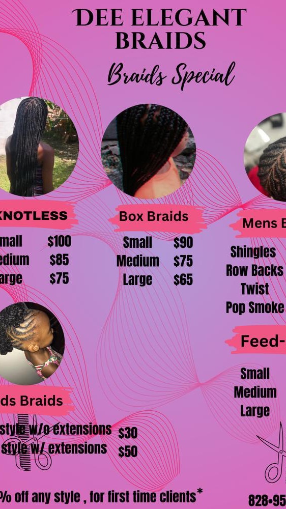 By booking with Dee Elegant Braids , you agree to these Policies & Terms. Dee Elegant Braids may cancel or reschedule a confirmed appointment if needed and will notify you as soon as reasonably possible. Please arrive on time; arriving late may shorten your service or require rescheduling. If you need to cancel or reschedule, please do so as early as possible; late cancellations and no-shows may incur a fee.