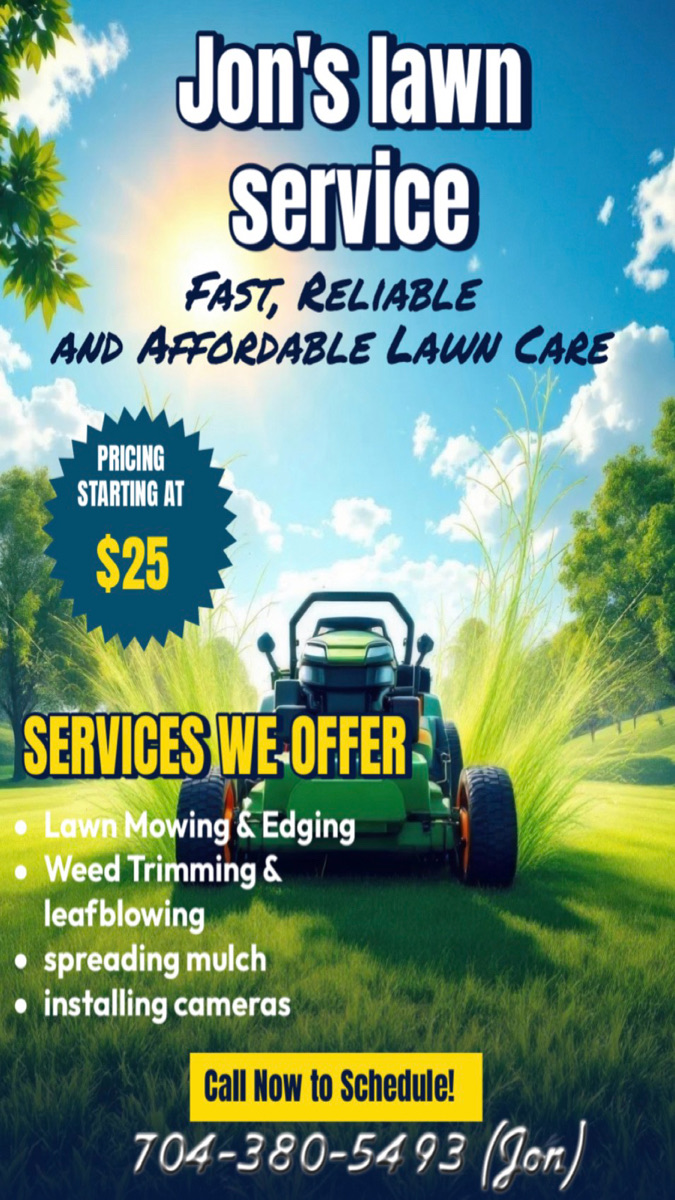 I am the owner of Jon’s lawn service. I have been in the business of doing lawn service for over 6 years and I will be happy to assist you with all lawn care needs. Prices are affordable and I work efficiently you will be highly satisfied by the work. I accept these following forms of payments Cash , Venmo and CashApp. Call now for a FREE ESTIMATE. Call at 704-380-5493. Thanks for booking with Jon’s lawn service !!!!