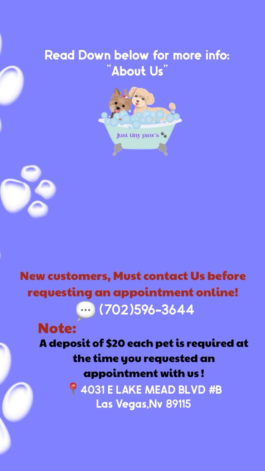 Just tiny paws 🐾 LLC. Small Dog grooming . 4031 E LAKE MEAD BLVD unit #B Las Vegas, Nv 89115 offering each one of you the individual attention low stress spa day for your pet and quality products and accessories personalized . I appreciate everyone for supporting our small business . ❤️🐾 We are looking forward of seeing you and your furbaby soon ! 😊 We love to a pamper your pet ! ………………………..🫧🐾🐶 About Us: Hi my name is Ana, I’m a mother of 3 kids and one furbaby toy poodle named Diego and grooming is my passion , I’m able to offer my services only part time and I’ve being grooming for 11 years now . I work with much love and care . quality over quantity . 🐾where your dog is Groomed in a gentle,caring and Stress Free Environment ❤️! No long waiting I offer one to one grooming, Because is all about what is best for your Pet!💕 Please note: ! New Customer must contact me first and answer a Few questions Before scheduling ! We require a deposit to schedule a one-to-one grooming with us! *Contact Hours. Monday-Friday (9am-5:00pm) Saturdays 10am-5:00pm Sunday: Closed ! Note: Sometimes I close one Saturday a month to have a full weekend with my family. So our Off days will vary. *Now all Baths include a paw 🐾 Balm , blueberry facial wash tearless 🫐 and Fresh breath spray .New Added! Also our services upgraded to our Premium Bath Hydra included to everyone. SMOOTH ROUGH, DRY PAW PADS. ELIMINATE EXCESSIVE LICKING AND ITCHING FROM ALLERGIES. RELIEVE REDNESS AND INFLAMMATION. HEAL CUTS, CRACKS, AND WOUNDS. PAW SOOTHER MOISTURIZES, AND HEALS YOUR PUP'S PAWS TO KEEP THEM NOURISHED AND HEALTHY. Offering grooming services since 2014! *Small Breeds Only up to 30 pounds* *No difficult Behavior* *First time clients please contact me first before scheduling*. *Additional Service Available. ( ask for info ) All dogs are washed with High quality Natural Brand Shampoos and Conditioner and I also include a Free Tearless Facial blueberry 🫐 wash and Paw balm ! Finish with a nice leave in conditioner spray , perfume and quality pet accessories of your choice: Bandana, ties or Hair bow. At no additional charge.:) ……………………………..🐾🐶 ! Possible Additional Fee If: *Difficult behavior that takes extra time and effort or require additional helper, there will be an additional fee of $10. starting price is for good behavior dogs and on a regular schedule/ good condition, to do a fast short cut . Price goes up based on many factors , Dog size, length/ volume of fur, hair cut style , behavior & fur condition . We offer a one-to-one Grooming and we love to Pamper your pet ! In my services I offer a Quality services and low stress to your pets and I use top quality products to my customers , will always keep the fair value and exceptional quality of service - our price is still affordable for an individual service that I offer with great dedication, love , care and less stress for your pet .:) Ana. Check it out My instagram page attached Below for more info and pictures of my work 😉 we are also on Google !