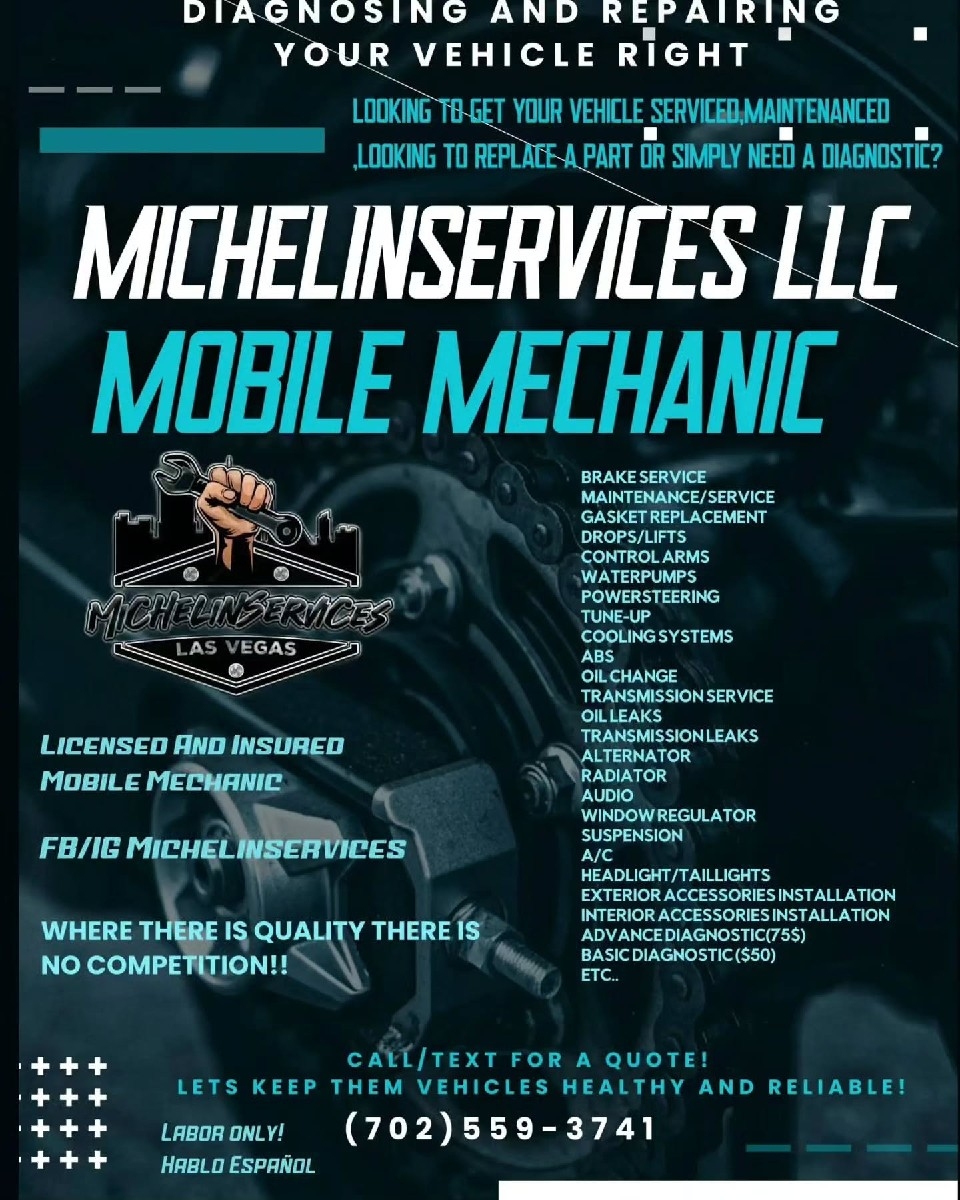 Las Vegas Mobile Mechanic-Michelinservices🔧 Maintenance/Service Brakes,audio, windows, A/c General part replace Suspension Lift🔧🧰 Looking to get your Vehicle Suspension replaced , Looking into Lowering your vehicle, or Wanna go more lifted? ⬆️⬇️↕️🔧🧰 Suspension Feels Loose? . -Looking for a Reliable Professional Honest Mobile Mechanic🔧🧰That Will Get The Work Done The Right way! Dont Hesitate Contact Me for a Quote! -100% Customer Satisfaction 100% Customer service My 1# PRIORITY Is To Keep Your Vehicle Running Smooth And Staying Safe! . -Where there is QUALITY THERE IS NO COMPETITION . Call/text for a Quote! Lets Keep Them Vehicles Healthy And Safe!