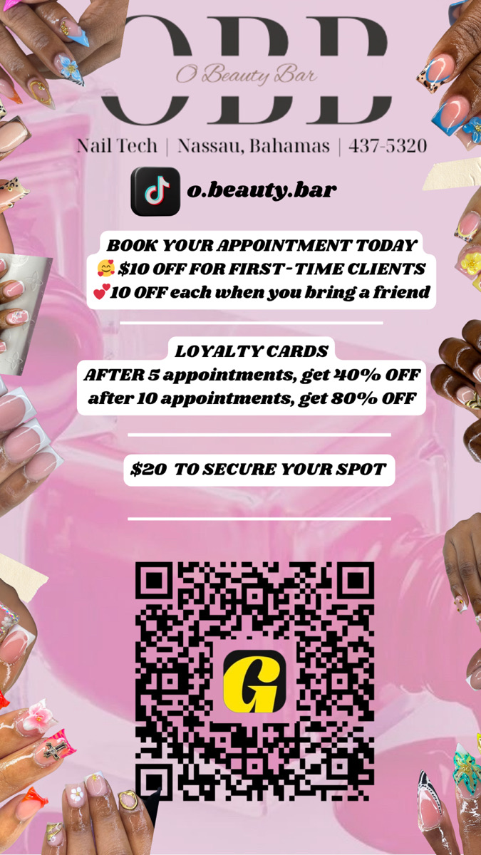 Hey my love ✨ thank you for visiting O Beauty Bar. Here, we offer Luxury Nail & Feet Services. Feel free to check our price list and book your luxury nail experience ✨ Once Appointments Are Booked Please WhatsApp 242-437-5320 to send screenshot of your deposit, after which you’ll receive the location. 🛑A $20 Non-Refundable Deposit is Required to secure your appointment. Without a Deposit, you DO NOT have an appointment. Failure to make deposit atleast 48hrs before the booked day will result in cancellation of your appointment. 🛑Extra Persons / kids are not allowed unless they are coming to get a service. 🛑If you wish to cancel an appointment please give me a call @ (242) 437-5320. Cancellations must be at least 48hrs before your appointment ❌ 🛑Late fee of $15 is applied once you are 15 minutes past your appointment time. 🏦 Banking Info Deposits can be sent to ✅Scotia Bank - Otanique Tarpley Account Number 70045-001530524 ✅Commonwealth Bank - Otanique Tarpley Account Number 1031016024 ✅RBC Bank - Otanique Tarpley Account Number - 05135-7411325 Once again thank you for choosing O Beauty Bar & See you soon beautiful💕