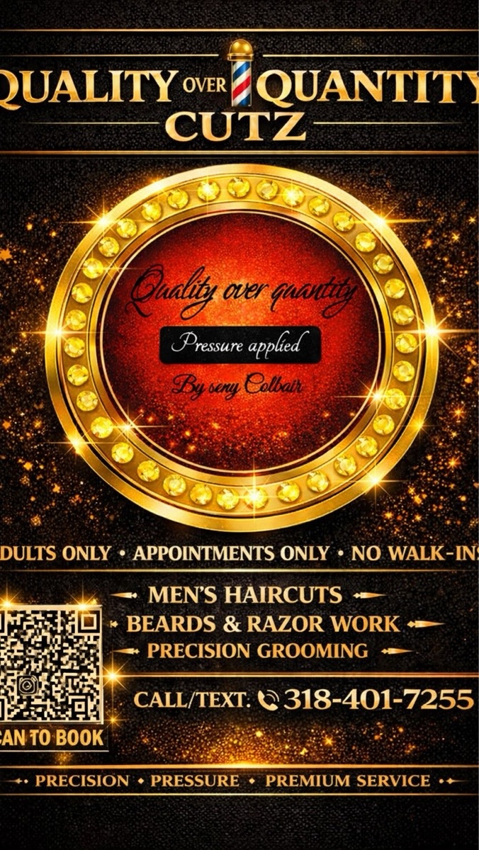 Quality over Quantity Cutz is a top-notch barbershop managed by a professional and licensed barber. Our team is dedicated to providing precision haircuts and grooming services that enhance your style and confidence. With a focus on quality over quantity, we prioritize attention to detail and personalized experiences for each client. From classic cuts to modern styles, our experienced barbers are committed to delivering exceptional results and superior customer care. Visit us today for a premium grooming experience that will leave you looking and feeling your best. Please call before coming to your appointment for address. Thank you .