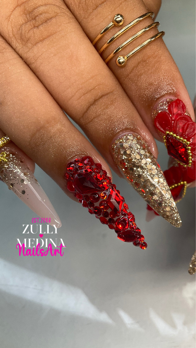 Servicio de uñas completo con extensión de dos tonos en tamaño largo 5/6, decorado con piedras de Rainston o diseño a elección del cliente.