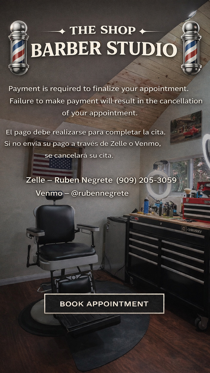 Payment must be made in order to complete appointment. No payment no appointment. El pago debe realizarse para completar la cita. Si no envía su pago a través de Zell o Venmo, se cancelará su cita. Zelle - Ruben Negrete (909) 205-3059 Venmo - @rubennegrete