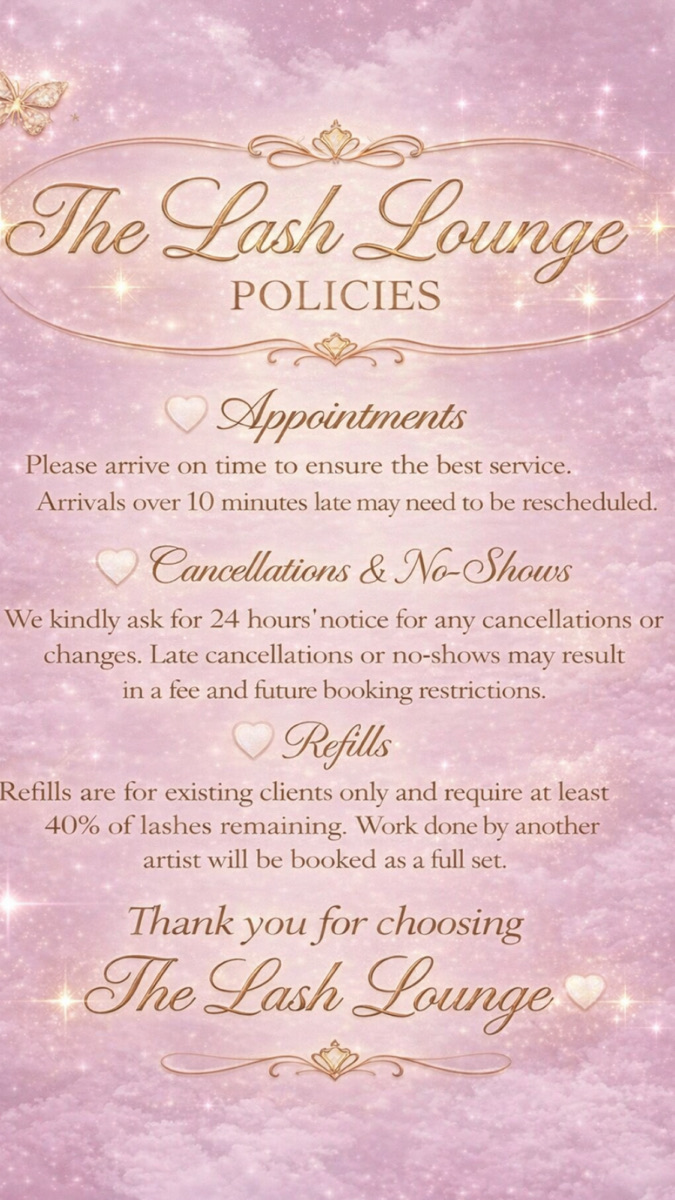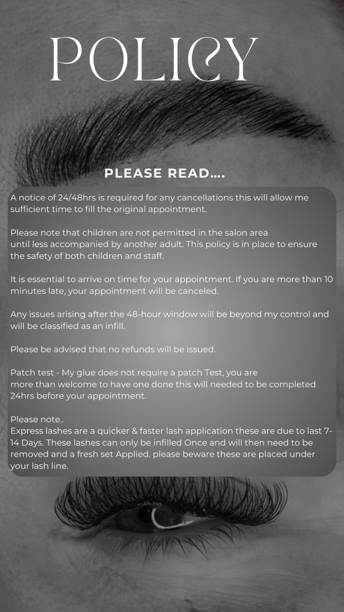 No shows | same day cancellations require a full payment before your next appointment. Any issues will be rectified within 48hrs, anything after will be classed as an infill. No refunds will be issued. Express lashes are a quicker and faster lash. They sit under your lash line which involves no isolation, (cluster lashes) these needs to be removed by myself. No refunds will be giving and the duration off then will depend on yourself. With accepting this you are agreeing to the terms and conditions in regards to express lashes. Thank you x